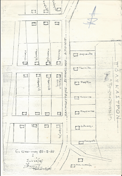 Χειρόγραφο σχεδίασμα του Ηλία Ταντίδη, 15 Φεβρουαρίου 1988, που δείχνει την σειρά εγκατάστασης των προσφυγικών οικογενειών, που δημιούργησαν το Νέο Καρασούλι, τον Οκτώβριο του 1922.