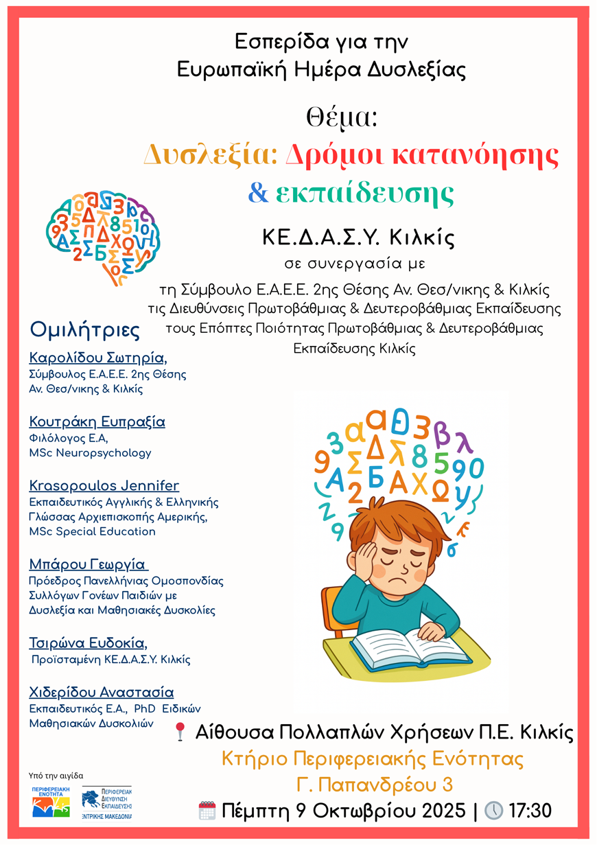 Το ΚΕ.Δ.Α.Σ.Υ. Κιλκίς σε συνεργασία με τη σύμβουλο Ε.Α.Ε.Ε. 2ης Θέσης Αν. Θεσ/νίκης & Κιλκίς, τις διευθύνσεις πρωτοβάθμιας & δευτεροβάθμιας εκπαίδευσης, τους επόπτες ποιότητας πρωτοβάθμιας & δευτεροβάθμιας εκπαίδευσης Κιλκίς, διοργανώνουν επιμορφωτική εσπερίδα με αφορμή την Ευρωπαϊκή Ημέρα Δυσλεξίας, με τίτλο: «Δυσλεξία: Δρόμοι Εκπαίδευσης & Κατανόησης».