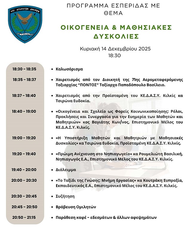 Με αφορμή την ανακήρυξη του Έτους 2025 από το Γενικό Επιτελείο Στρατού ως Έτος Οικογένειας, η 71η Αερομεταφερόμενη Ταξιαρχία, σε συνεργασία με το Κέντρο Διεπιστημονικής Αξιολόγησης, Συμβουλευτικής και Υποστήριξης (ΚΕ.Δ.Α.Σ.Υ.) Κιλκίς, διοργανώνει εσπερίδα με θέμα: «Οικογένεια & Μαθησιακές Δυσκολίες».