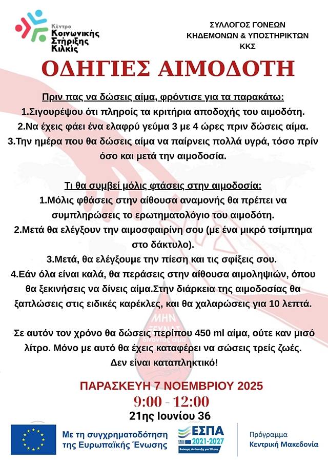 Το Κέντρο Κοινωνικής Στήριξης σας προσκαλεί στην 11η Αιμοδοσία που θα πραγματοποιηθεί την Παρασκευή 7 Νοεμβρίου 2025 και ώρα 9:00π.μ. – 12:00μ.μ. στις εγκαταστάσεις του φορέα μας 21ης Ιουνίου 36.