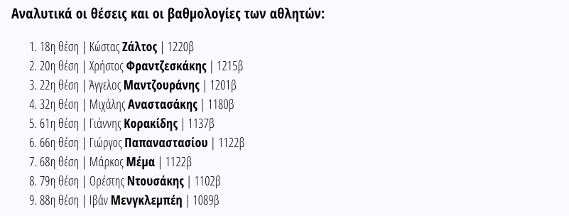 Ακολουθούν ο Χρήστος Φραντζεσκάκης στην 20ή θέση και ο Άγγελος Μαντζουράνης στην 22η θέση, ενώ ο Μιχάλης Αναστασάκης βρίσκεται στην 32η θέση.