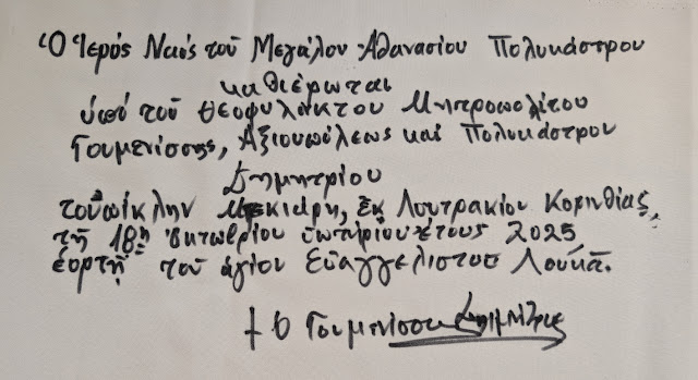 Ὁ ἄρτι ἐγκαινιασμένος Ναός ἀποτελεῖ τό 32ο θυσιαστήριο-ἐκκλησία πού ἐγκαινιάσαμε στήν Μητρόπολη Γουμενίσσης, ἀπό τήν ἐνθρόνισή μας μέχρι σήμερα. Μέ τήν χάρη καί τό πλούσιο ἔλεος τοῦ Θεοῦ, μέ τήν ἀθέατη βοήθεια τῶν Ἁγίων καί τήν ἀποτελεσματική συναρωγή τοῦ πληρώματος, δέν ὑπάρχει Ἐνορία χωρίς ἀξιοθαύμαστο ναό γιά τά ἐπαρχιακά μας δεδομένα. Μέ δική μας ὑποκίνηση, ἐποπτεία καί συμπαράσταση (παράδειγμα εὔγλωττο ἡ Ἁγία Τριάδα Πολυκάστρου, ἕνας ναός ἐμβληματικός, ἄν καί νεότερος), τόσο ἡ μεγάλη φιλοτιμία τῶν ἱερέων μας, ὅσο καί ὁ παράλληλος ζῆλος τῶν λαϊκῶν στελεχῶν, ὑλοποίησαν ἕνα δυσκολοκατόρθωτο ἀποτέλεσμα: σέ 34 χρόνια ποιμαντορίας νά ἔχουν ἀνεγερθεῖ 32 ναοί στήν ἐπαρχία μας, χωρίς ποτέ νά ἔχει ἐπιζητηθεῖ ἤ ἐξασφαλιστεῖ ἐπιδότηση οἱουδήποτε πολιτειακοῦ φορέα.