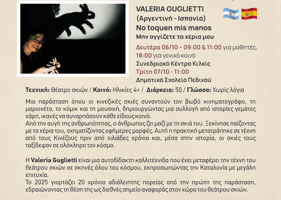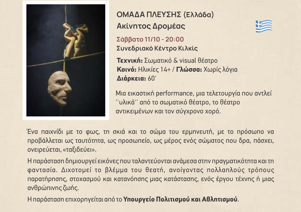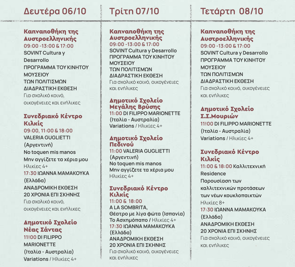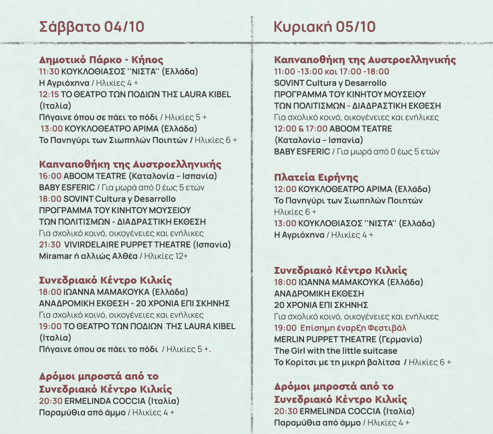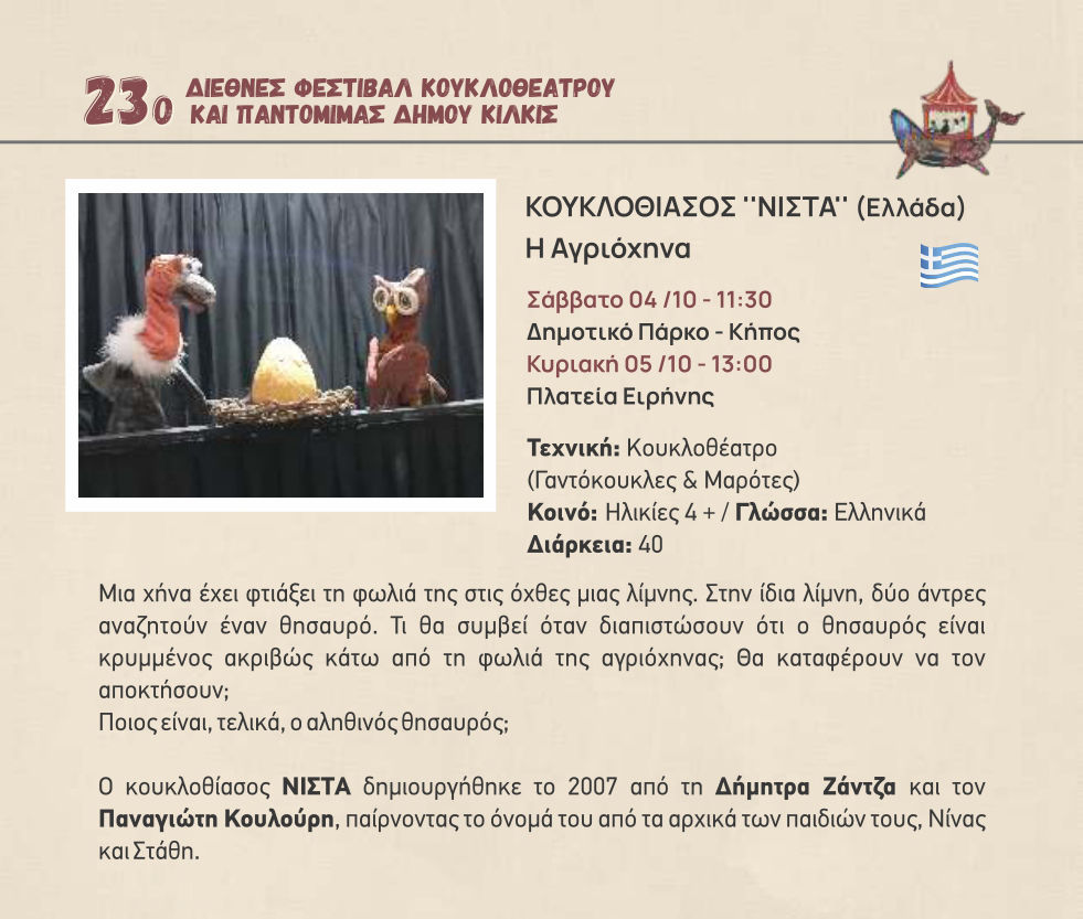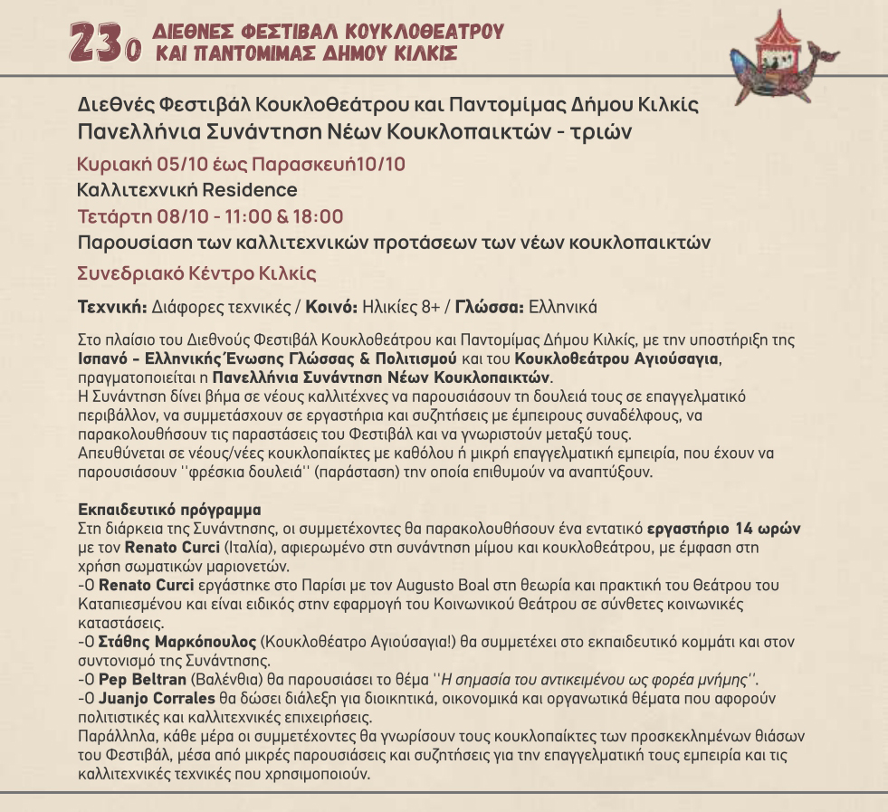 Το 23ο Διεθνές Φεστιβάλ Κουκλοθεάτρου και Παντομίμας του Δήμου Κιλκίς ανοίγει διάπλατα την πύλη του ονείρου στους πολυάριθμους φίλους του από τις 4 έως τις 13 Οκτωβρίου με παραστάσεις κουκλοθεάτρου και παντομίμας, θέατρο δρόμου, παιδικό παιχνίδι, αναδρομικές εικαστικές και διαδραστικές εκθέσεις, στους οικείους χώρους του Συνεδριακού Κέντρου Κιλκίς, στην Καπναποθήκη της Αυστροελληνικής, στην πλατεία Ειρήνης και στο Δημοτικό Πάρκο – Κήπο.
