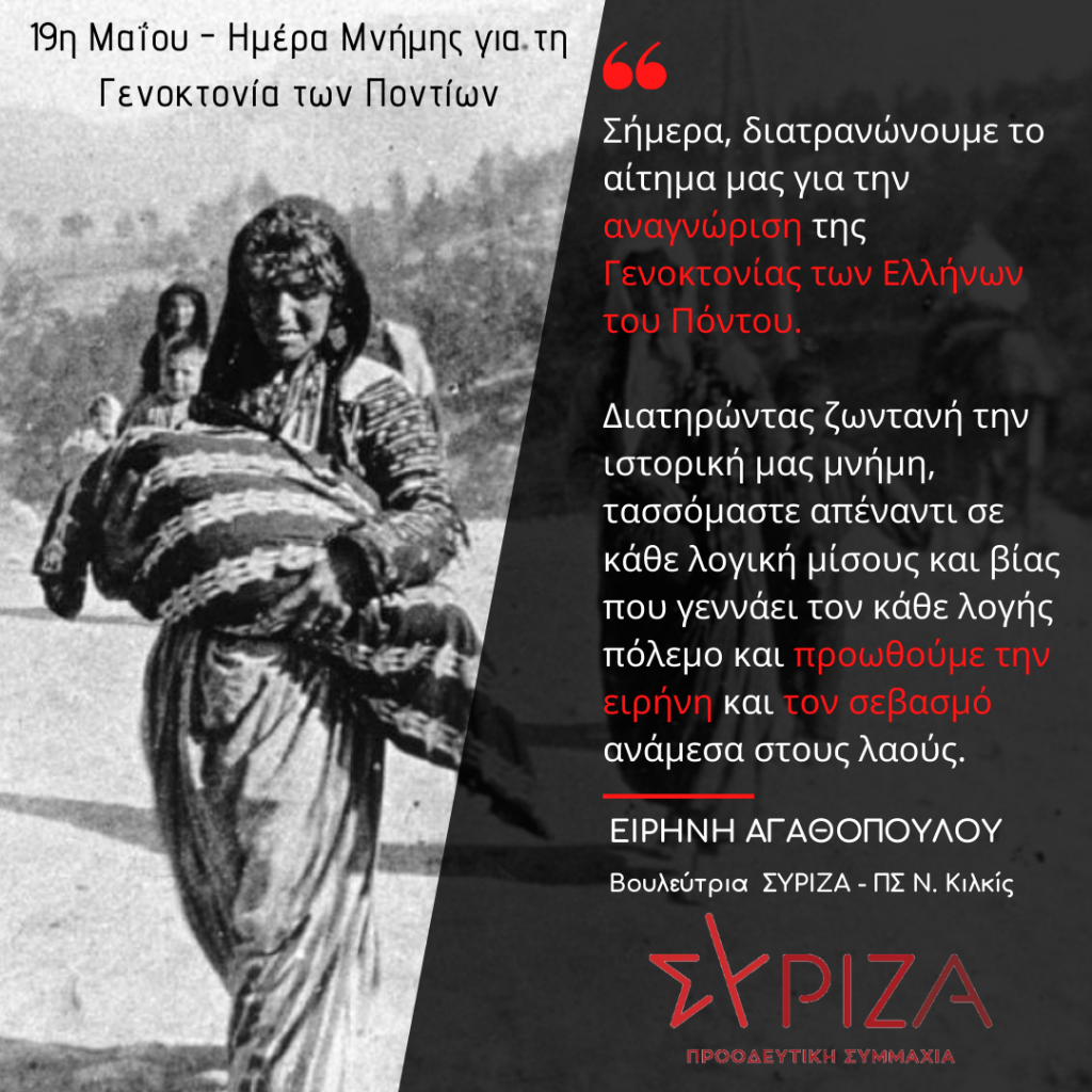 Με αφορμή την ημέρα μνήμης της γενοκτονίας εις βάρος του Ελληνισμού του Πόντου, η βουλεύτρια Κιλκίς του ΣΥΡΙΖΑ – «Προοδευτική Συμμαχία» Ειρήνη – Ελένη Αγαθοπούλου, προέβη στην ακόλουθη δήλωση: