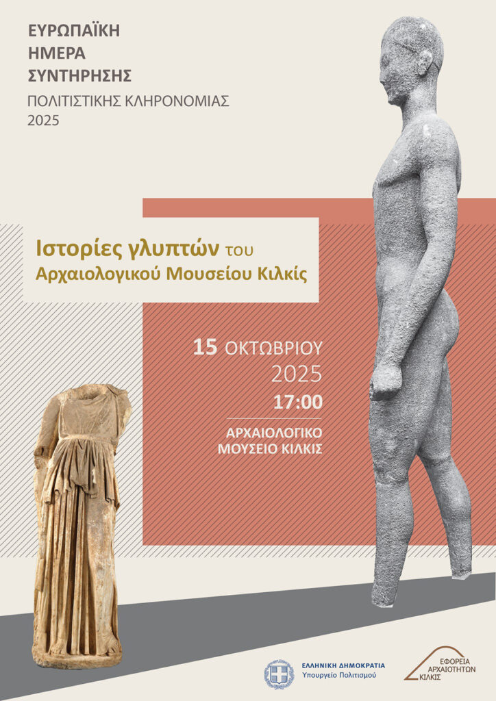 Στο πλαίσιο του εορτασμού της «Ευρωπαϊκής Ημέρας Συντήρησης της πολιτιστικής κληρονομιάς 2025», η ΕΦΑ Κιλκίς πραγματοποιεί την ερχόμενη Τετάρτη τη δράση «Ιστορίες γλυπτών του Αρχαιολογικού Μουσείου Κιλκίς», στον χώρο του Μουσείου.