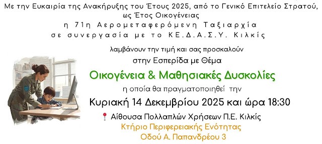Με αφορμή την ανακήρυξη του Έτους 2025 από το Γενικό Επιτελείο Στρατού ως Έτος Οικογένειας, η 71η Αερομεταφερόμενη Ταξιαρχία, σε […]