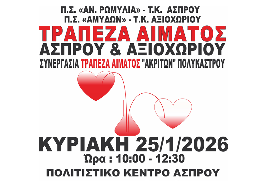 Την Κυριακή 25 Ιανουαρίου 2026 από τις 10 το πρωί έως τις 12.30 μετά το μεσημέρι,, στο “Πολιτιστικό κέντρο του Άσπρου”, θα πραγματοποιηθεί […]
