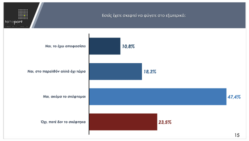 Την ίδια ώρα, περίπου 6 στους δέκα νέους στην Περιφέρεια Κεντρικής Μακεδονίας έχουν αποφασίσει ή σκέφτονται να εγκαταλείψουν την χώρα για το εξωτερικό. Πρώτοι που δηλώνουν πως «έχουν αποφασίσει να εγκαταλείψουν τη χώρα» είναι οι Θεσσαλονικείς και ακολουθούν οι κάτοικοι των άλλων νομών της Κεντρικής Μακεδονίας. Αναλυτικότερα: το 10,8% δήλωσε «Ναι, το έχω αποφασίσει», το 18,3% «Ναι, στο παρελθόν αλλά όχι τώρα», το 47,4% «Ναι, ακόμα το σκέφτομαι» και το 23,5% «Όχι, ποτέ δεν το σκέφτηκα».