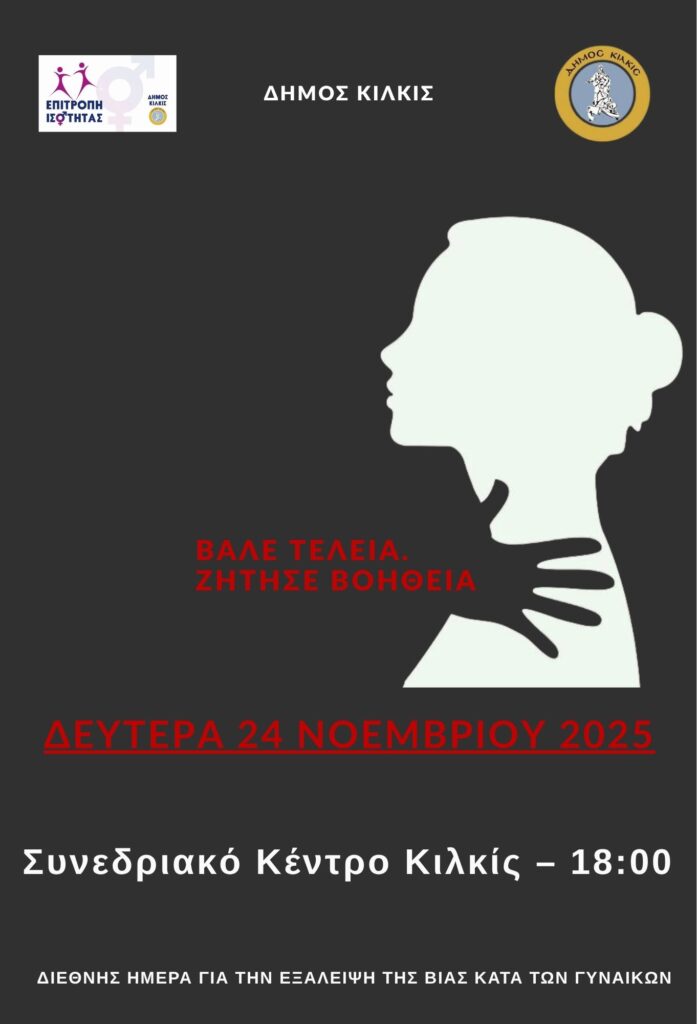 Ο Δήμος Κιλκίς και η Δημοτική Επιτροπή Ισότητας, με αφορμή την 25η Νοεμβρίου, Διεθνή Ημέρα για την εξάλειψη της βίας κατά των γυναικών, προσκαλούν τους πολίτες στην ανοιχτή δημόσια συζήτηση με θέμα “Βάλε τελεία. Ζήτησε βοήθεια” τη Δευτέρα 24 Νοεμβρίου στις 18:00 στο Συνεδριακό Κέντρο του Δήμου Κιλκίς.