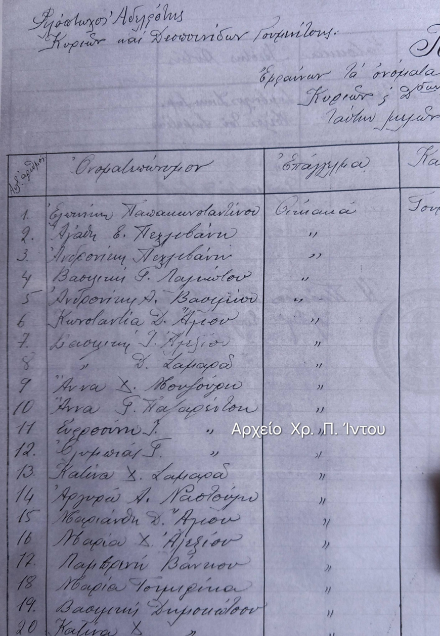 Τακτικά και αναπληρωματικά μέλη του συμβουλίου: Μαρία Ευαγ. Μαλέγκου, Αργυρώ Α. Ναστούλη, Αικατερίνη Χρ. Σαμαρά, Ευμορφία Ασμενιάδου, Αικατερίνη Θ. Μαλέγκου, Αφροδίτη Χ. Παζαρέντσου, Ζωή Βαφοπούλου, Άννα Δ. Παζαρέντσου, Μαρία Ι. Οικονόμου, Άννα Χ. Μουζούρη, Βασιλική Ι, Αλεξίου.