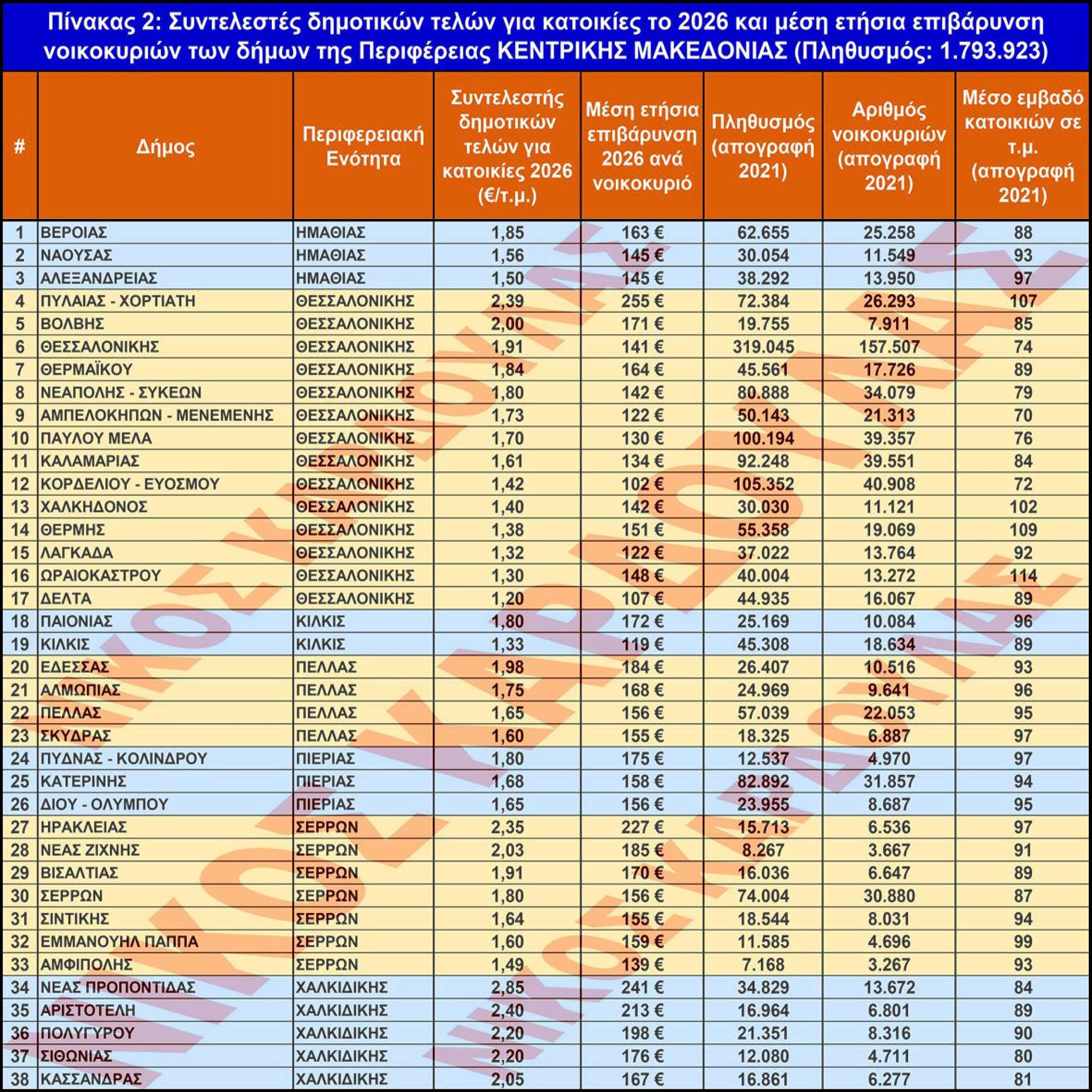 Στην έρευνα παρουσιάζονται στους πίνακες οι συντελεστές των δημοτικών τελών κατοικιών και η μέση ετήσια επιβάρυνση ανά νοικοκυριό το 2026, καθώς και ο πληθυσμός, ο αριθμός των νοικοκυριών και το μέσο εμβαδό των κατοικιών των δήμων, ανά περιφέρεια και περιφερειακή ενότητα (ΠΕ), σύμφωνα με στοιχεία από τη «Διαύγεια» και την ΕΛΣΤΑΤ.