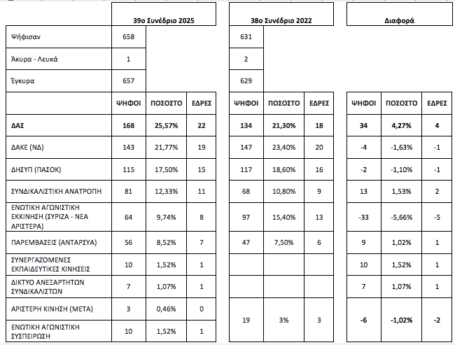 Η ΔΑΣ, που το ψηφοδέλτιό της συγκροτείται με συνδικαλιστές που συσπειρώνονται στο Π.Α.ΜΕ. με μεγάλη άνοδο σε ψήφους, ποσοστά και έδρες – από 134 ψήφους, 21,3% και 18 έδρες το 2022 σε 168 ψήφους, 22 έδρες και 25,57% – αναδείχθηκε πρώτη δύναμη γκρεμίζοντας την κυβερνητική παράταξη της ΔΑΚΕ από αυτή τη θέση.