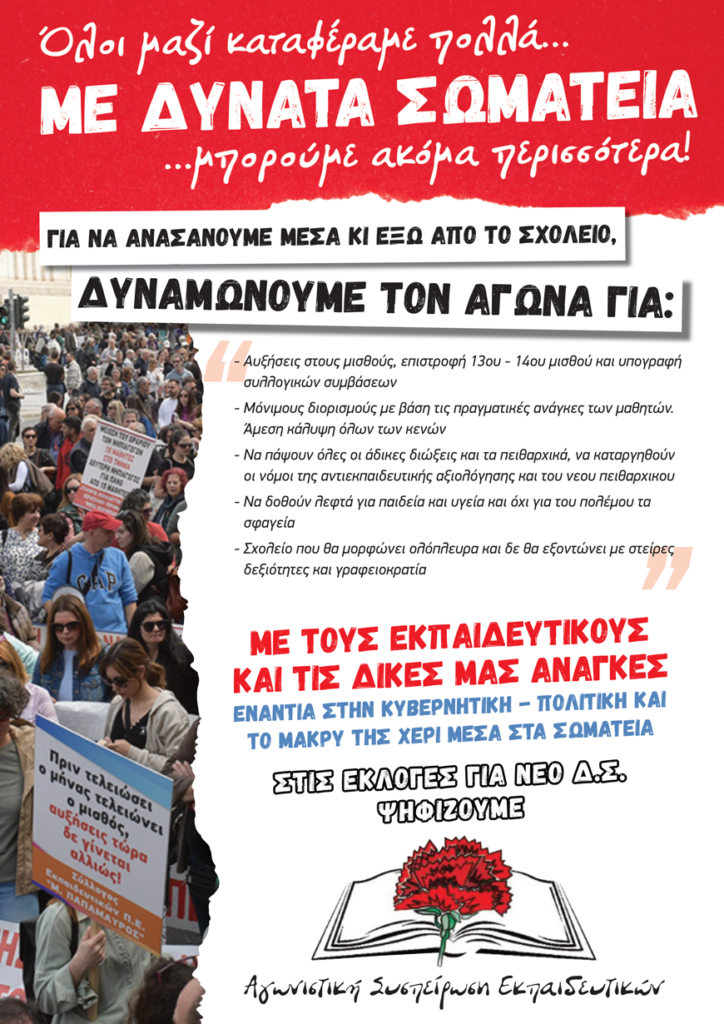 …χρειάζεται να είναι μαχητικό, να αποτελείται από συναδέλφους και συναδέλφισσες που θα αγωνίζονται με σθένος, ανιδιοτέλεια και αυταπάρνηση για όλα τα ζητήματα που μας αφορούν και αγωνιούμε, όπως είναι οι εκπρόσωποι της «Αγωνιστικής Συσπείρωσης Εκπαιδευτικών»