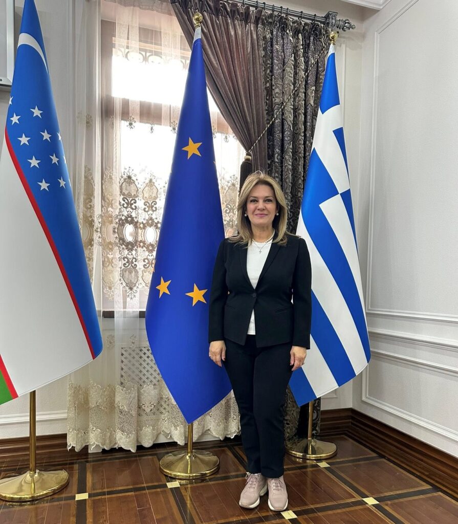 Το 2025 η πρώτη Ελληνίδα πρέσβης Παρασκευή Τζεβελέκη συστήνει την Ελληνική Πρεσβεία στην Τασκένδη.