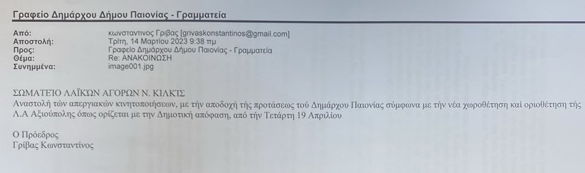 Η διοίκηση του σωματείου λαϊκών αγορών νομού Κιλκίς αθέτησε την συμφωνία που επετεύχθη στις 14 Μαρτίου με την διοίκηση του δήμου και είναι αποκλειστικά υπεύθυνη για την απεργία όπως αποδεικνύεται και από την σχετική ηλεκτρονική αλληλογραφία που δημοσιοποιούμε σήμερα.
