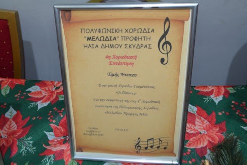 Με ιδιαίτερη χαρά αποδέχθηκε η μικτή χορωδία του συλλόγου των Παιόνων Γουμένισσας, με χοράρχη τον Αντώνιο Παπαδόπουλο την πρόσκληση συμμετοχής στην 4η Χορωδιακή Συνάντηση που πραγματοποιήθηκε στο πνευματικό κέντρο Σκύδρας, το Σάββατο 13 Δεκεμβρίου 2025, στις 6 το απόγευμα, με τη συμμετοχή εξαιρετικών χορωδιών από την Κέρκυρα, την Άμφισσα, το Κορδελιό, καθώς και τη χορωδία «Μελωδία» Προφήτη Ηλία, οικοδεσπότη της βραδιάς.